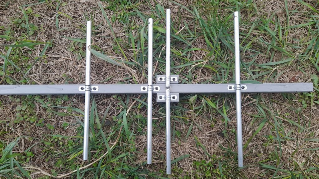 10 элементов Яги на 70 см диапазон. Строилась на 446 МГц, пока на земле резонанс на 435 МГц, думаю, что на высоте 7 метров куда она проектировалась, встанет на свою частоту.