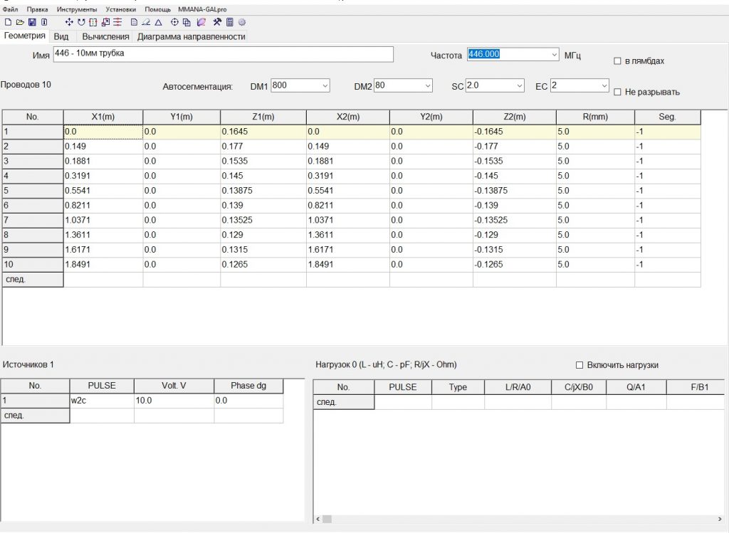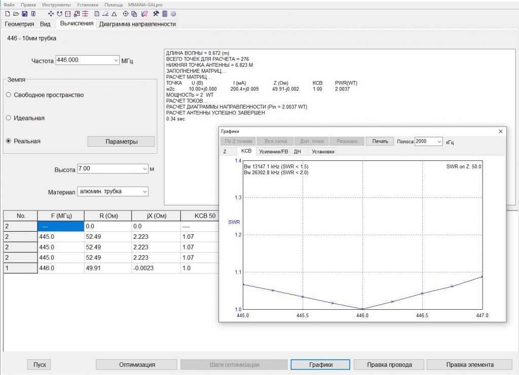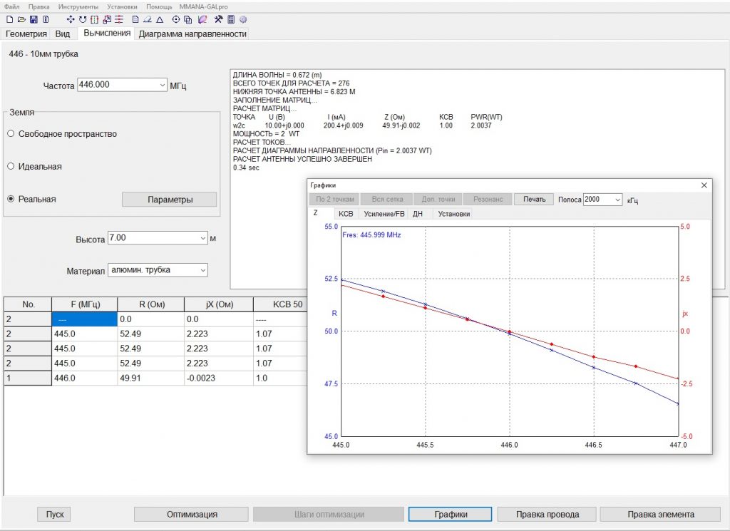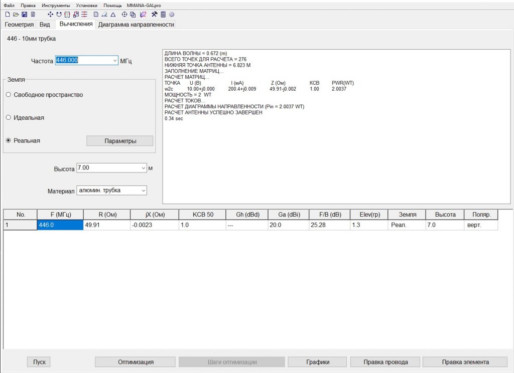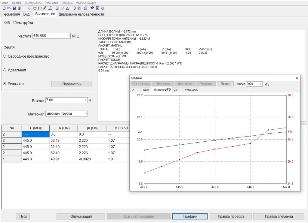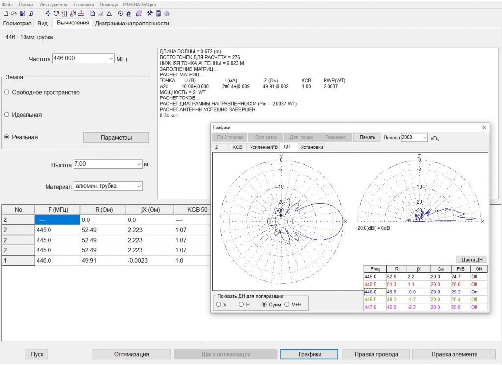 Программа сама оптимизировала на 446 МГц ранее смоделированную мной антенну на 430 МГц и по графикам показания равны: КСВ 1, Активное сопротивление 49,91 Ом, реактивное сопротивление 0,0023 Ом, что равно 0, Усиление в свободном пространстве 15 Дб, подавление сзади 25,28 Дб.