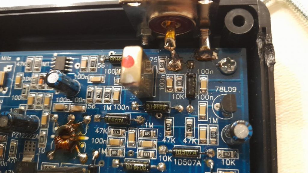Пришлось произвести ремонт прибора. Центральный контакт разъёма сделан неудачно, при подсоединении антенны идет нагрузка и место пайки ломается. Происходит обрыв и показания улетают в «космос». Нужно делать гибкое соединение в виде тонкой медной проволоки.