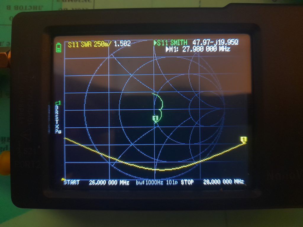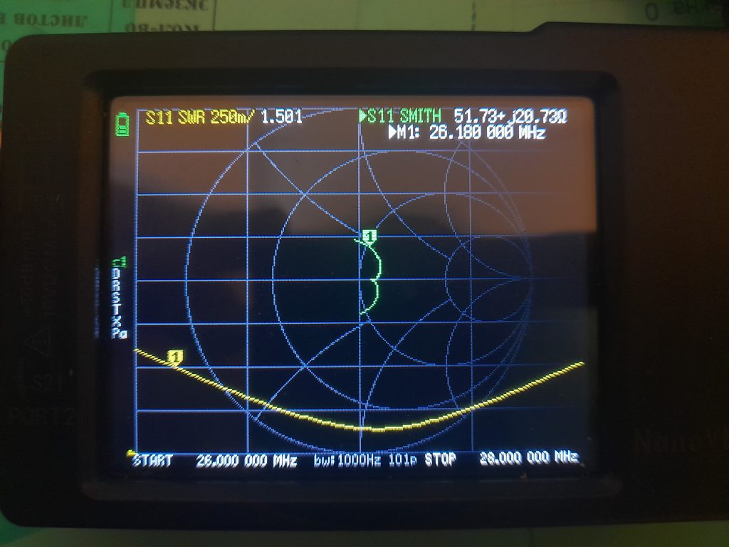 После установки, анализатор показал, что резонанс антенны был на частоте 26.200 МГц, пришлось укорачивать, всего 2 раза я спускал и снимал антенну с мачты, первый раз укоротил её на 15см и попал на частоту 26.800 МГц, второй раз укоротил еще на 15 см и попал точно на 27.200 МГц — ровно посередине сетки D. По итогу получил полосу 1.8 МГц при КСВ 1.5, что очень хорошо!
