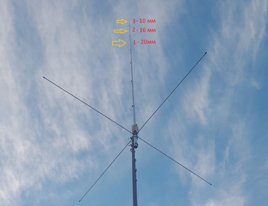Длину самой антенны делал 723см от точки запитки до кончика штыря — как в описании оригинальной Sirio Tornado 27 5/8. Добавил еще 3 трубки диаметром 20, 16 и 10 мм. Ранее писал, что рассчитывал на 16 и 10 мм трубки, но докупил ещё 20мм.