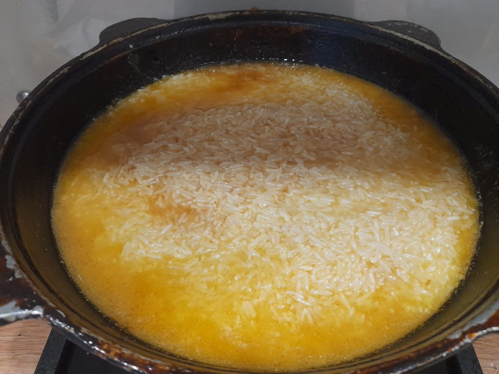 Оставляем выкипать на медленном огне. Можно делать углубления в рисе, чтобы контролировать жидкость.