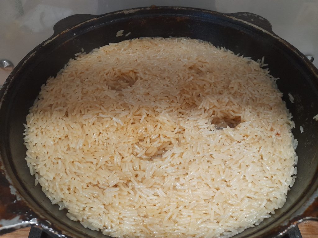 В конце, когда вы убедитесь, что рис готов, можно всё перемешать и накрыть например полотенцем а сверху положить широкую плоскую тарелку вверх дном, выключить огонь и дать плову успокоиться. Это делают тогда, когда варят большой объём, там рис сверху не всегда удаётся пропарить, и это помогает.