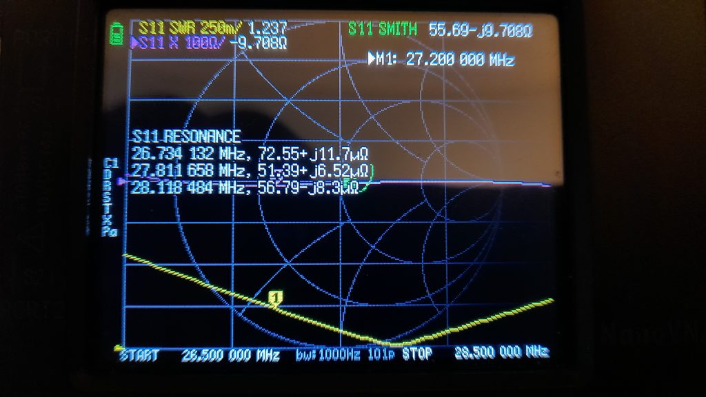 По итогу получилось, что резонанс сильно сместился вверх по частоте, от 27.090 до 27.800 это слишком много, так сильно просесть антенна не могла, хотя, удочка в двух местах опустилась из-за ветров.