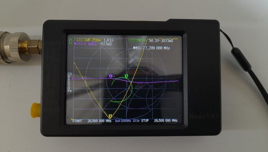 2025-06-14. Очередная доработка антенны. На этот раз растянул её ровно горизонтально, без наклона, КСВ убежало на 27.900 МГц. Укоротил на 5 см конец провода центральной жилы. Теперь длина полотна антенны = 11,48 метра.