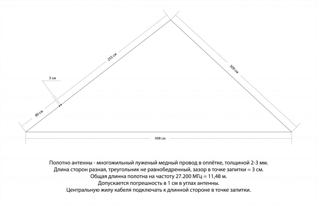 Делюсь размерами своей (горизонтальной) антенны треугольника на 27.200 МГц. Повторив их, у вас вероятно будут другие показания замера на частоте. Но, как старт, они вам сократят время, которое вы потратите на поиск размеров. КСВ настраивается изменением длин сторон в точке запитки, чаще малой.